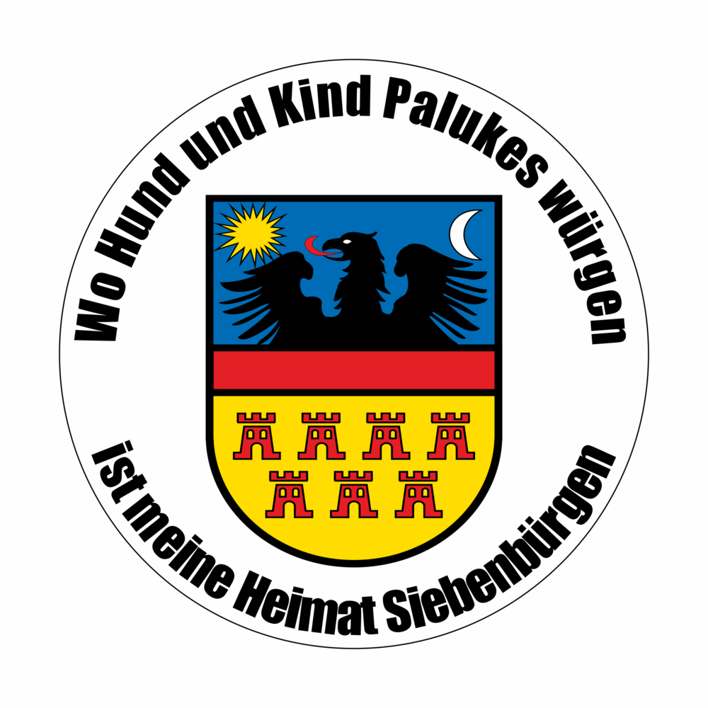 Aufkleber mit dem Wappen von Siebenbürgen und dem bekannten Spruch: „Wo Hund und Kind Palukes würgen, ist meine Heimat Siebenbürgen“
