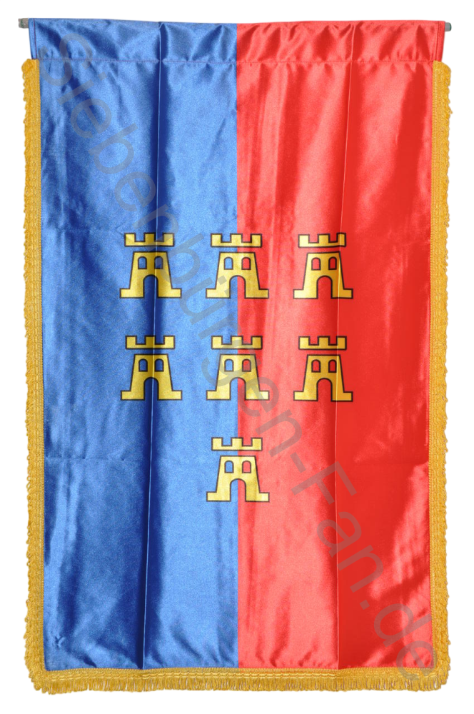 Dieses edle Banner zeigt die sieben Burgen aus dem historischen Wappen der Siebenbürger Sachsen auf blauroten Grund und verbindet traditionelle Symbolik mit moderner Verarbeitung. Das Material besticht mit einem brillanten Druck durch glänzende, leuchtende Farben, die das Motiv lebendig wirken lassen. Die gelben Fransen rundum unterstreichen den festlichen Charakter und machen die Fahne zu einem Blickfang bei kulturellen Veranstaltungen, Gedenktagen oder als Wanddekoration.