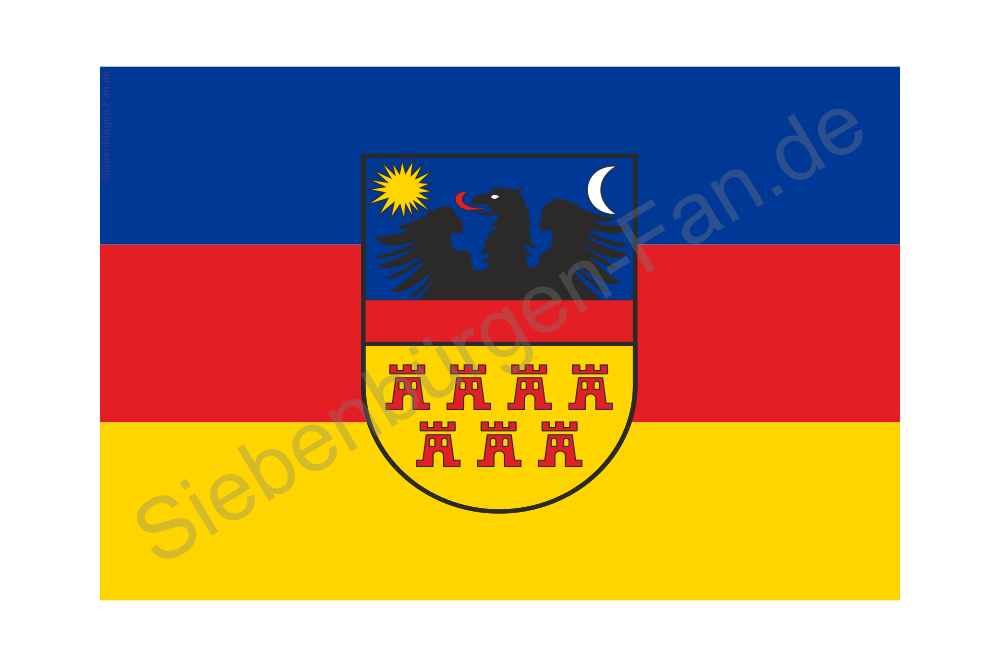 Diese Fahne zeigt das historische Wappen des Großfürstentums Siebenbürgen, wie es seit dem späten 16. Jahrhundert überliefert ist. In der hier dargestellten Form ist das Wappen um 1590 erstmals belegt. Seine endgültige Festlegung als Landeswappen erfolgte 1765 durch Kaiserin und Königin Maria Theresia anlässlich der Erhebung des Fürstentums Siebenbürgen zum Großfürstentum.