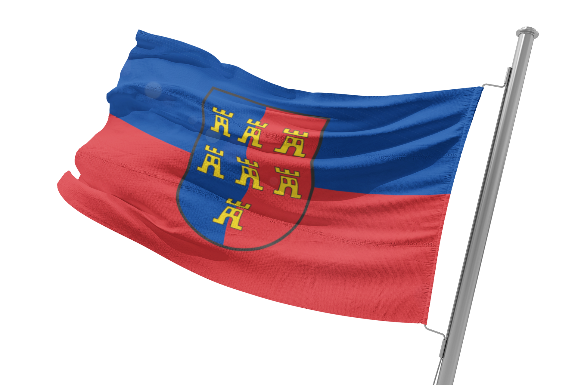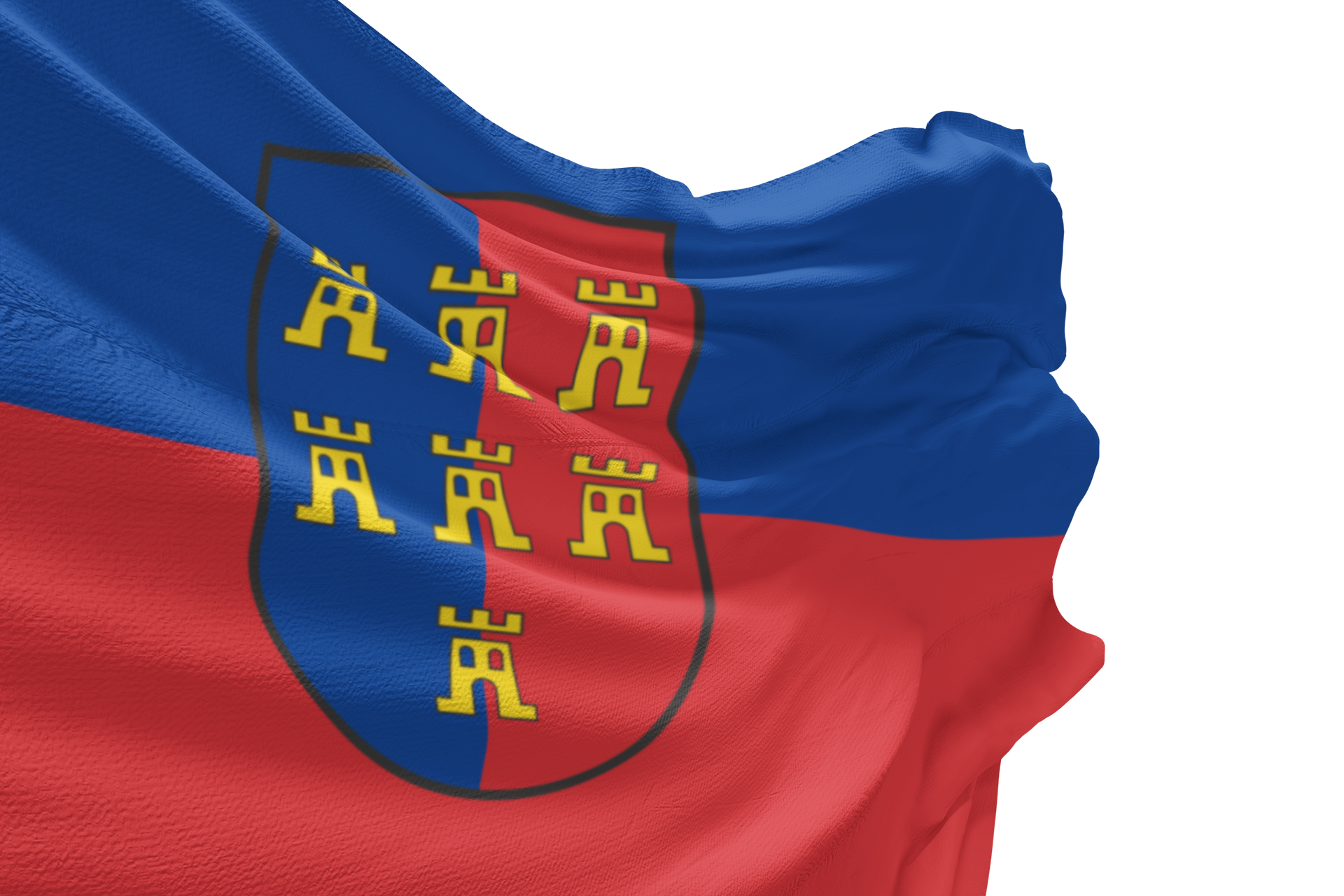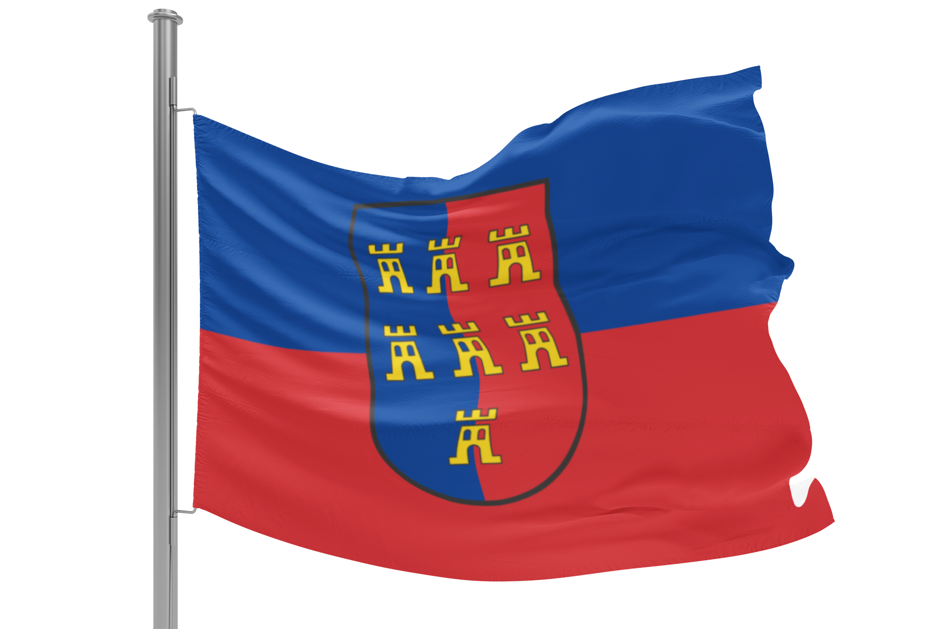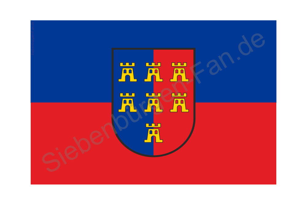 Diese Fahne zeigt das historische blaurote Wappen der Siebenbürger Sachsen. Das Wappen wurde am 1. Oktober 1933 vom Volkstag der Siebenbürger Sachsen offiziell für das Sachsenland beschlossen: